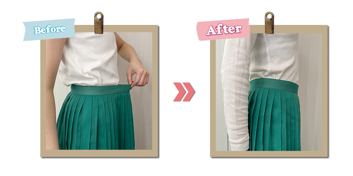 ▼お直しメニュー スカートのウエスト詰め 綺麗な色に一目ぼれでSALEで購入したスカート。 購入後自宅で着用してみるとウエストが大きく腰履きに…😢 試着をせずに購入したら「サイズが合わなかった」という経験はございませんか? SALE品の場合返品することも出来ず、結局1回も着てないというケースも… そんなときは、ビック・ママにご相談を★ 貴方にピッタリのサイズにお直ししましょう!